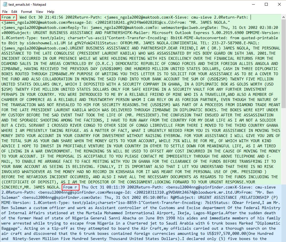 「From r」起头的电子邮件 绿色区域是第一封邮件,蓝色区域是第二封邮件。可以看到,这两封邮件都是以 From r 开始的(红框所示)。 本教程使用 Fraudulent Email Corpus 的原因之一是表明当数据未经整理、不熟悉且没有说明文档时,只通过编写代码不能整理好它。这还需要人眼。正如刚才我们做的那样,我们必须阅读这个语料库,了解它的结构。此外,这些数据可能还需要大量清理工作;这个语料库也是如此。比如说,尽管我们使用本教程即将构建好的完整脚本算出这个数据集中有 3977 封邮件,但实际上还有更多。某些电子邮件不是以 From r 开始的,所以就没有被分开。但我们还是这样使用我们的数据集,否则本教程还会更长。 还要注意,我们使用了 contents.pop(0) 来避开列表中的第一个元素。这是因为 From r 也在第一封电子邮件之前。当分割该字符串时,它会在索引 0 的位置产生一个空字符串。我们即将编写的脚本是为电子邮件设计的。如果用它来操作空字符串,可能会报错。避开空字符串能让我们避开会造成脚本执行中断的错误。 用 for 循环获取每个名称和地址 现在,我们处理 contents 列表中的电子邮件。 for item in contents: emails_dict = {}