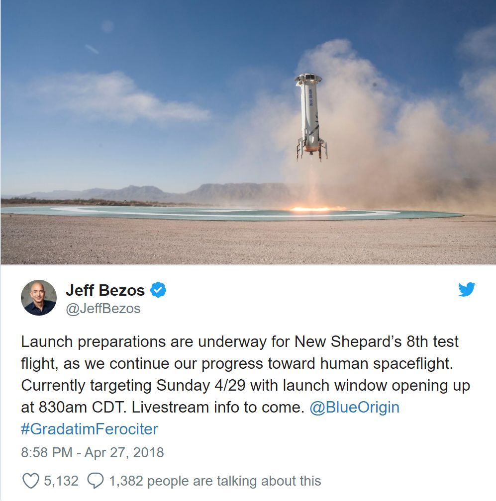 据创始人 Jeff Bezos 透露,私人太空公司 Blue Origin 将于周日发射其第三枚 New Shepard 火箭。 发射会定于美国东部时间上午 9:30 / 8:30 CDT,并将现场直播。 这将是 New Shepard 火箭第八次飞行,也是这枚火箭的第二次飞行。 2015 年 4 月 29 日,第一枚 New Shepard 火箭(NS1)举行首次飞行,飞行高度达到 93.5 公里(307,000 英尺)。试飞本身是成功的,太空舱借由降落伞顺利降落,但火箭坠毁,主因是液压系统在下降过程中故障。 当年 11 月,公司成功垂直降落第二枚 New Shepard 火箭,并首次运送物品进入太空。退役前,公司将这枚助推器再次用于当年 10 月的第四次发射。 2017 年 12 月,公司成功发射并回收了一款新型 Shepard 火箭助推器(第三枚),也就是明天将要发射的这枚火箭。 New Shepard 最终将把乘客带入太空。不过,Blue Origin 的雄心不仅仅是将太空游客送入轨道,去年它展示了其新格伦(New Glenn)火箭的计划,计划在 2020 年启动后将货物送入轨道。 Blue Origin 计划在今年晚些时候为 New Shepard 组队首次航班机组。首席执行官 Bob Smith 去年表示,他的公司计划在 2019 年之前将第一批乘客送入太空。 ]]> 原文: https://ift.tt/2rcoj1h | | 机器知心 | | |