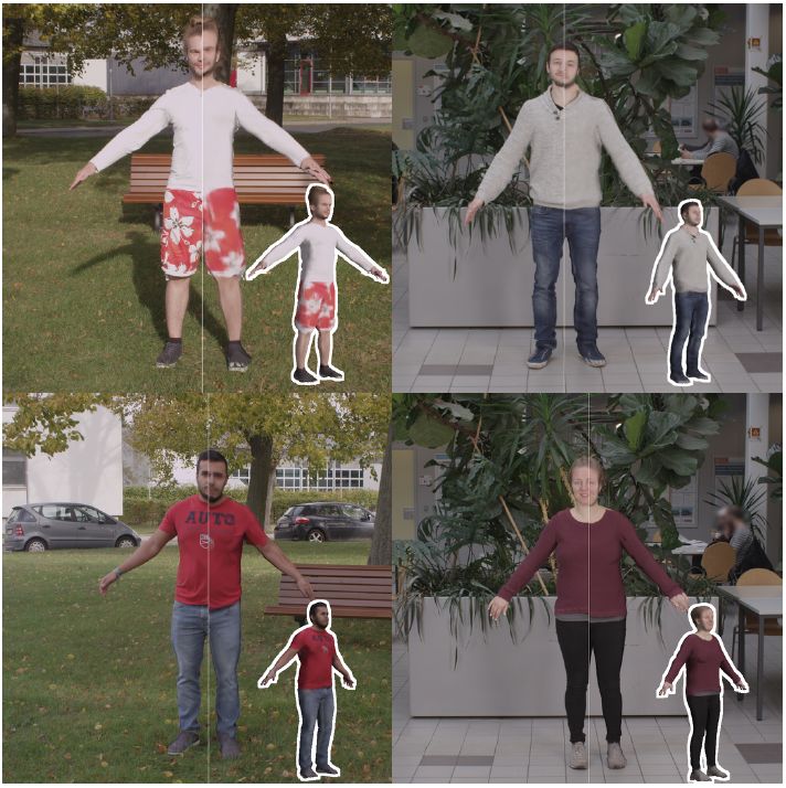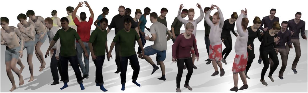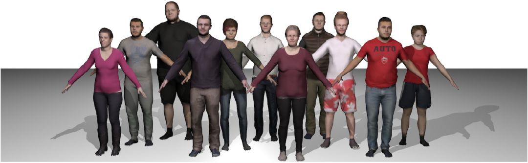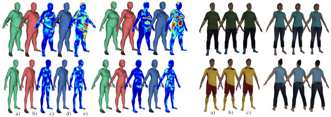 图 7:定性测试结果:因为重构的模版与 SMPL 人体模型有同样的拓扑结构,我们可以使用 SMPL 来改变重构形体的姿态和外形。虽然 SMPL 不建模带衣着人体的变形,但变形模版看起来还是可信的,从质量上来看足够承担多种应用。