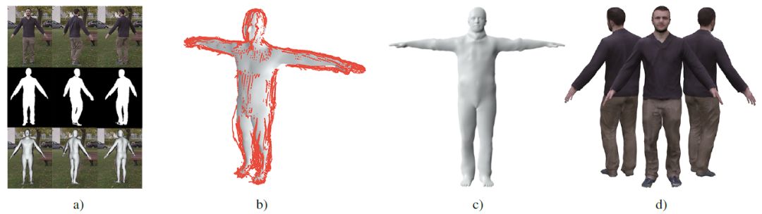 图 1:本论文提出的技术首创从人的单个视频序列中提取精确的 3D 人体模型,包括头发和衣服,这些人在摄像机前面移动,从而保证我们能从各个角度看到他们。 视频demo: 引言 在许多应用中,包括虚拟现实和增强现实、用于监视的人体跟踪、游戏或生物测定,都需要人的个性化现实和可动画化的 3D 模型。该模型应包括特定个人身体的静态几何形状、头发和衣物,以及连贯的表面纹理。 获取这种模型的一种方法是使用昂贵的主动式扫描仪。但是这种扫描仪的尺寸和成本妨碍了它们在消费级应用软件中的使用。或者,可以使用来自一组密集静态身体姿势图像的多视角被动重建 [22, 46]。然而,人们很难长期站立不动,因此这一过程耗时且容易出错。此外,消费级 RGB-D 相机可用于扫描 3D 人体模型 [39],但这些专用传感器的可用性并不像普通摄像头那样广泛。此外,所有这些方法仅重建表面形状和纹理,而没有内部装配动画骨架。所有上述应用将受益于从单目 RGB 视频自动重建个性化可移动替身的能力。 尽管利用深度数据重建 3D 人体模型 [6, 71, 81] 或自由曲面 [86, 44, 47, 21] 的研究近年来已经有了很大进步,但对单目视频中穿衣服的人类进行 3D 重建(没有对该人进行预先扫描)的问题并未解决。在这篇论文中,研究者评估了单个视频中穿衣服的人的外形(视频中的人是运动的)。一些方法利用单个图像推断参数化人体模型的外形参数 [7, 20, 5, 27, 83, 34],但是重建受限于参数空间,无法捕捉每个人体的外形细节和衣物几何图形。 为了从视频序列中估计几何图形,研究者优化受限于人体模型的单个自由外形,以拟合 F 个图像的集合。不过,这需要一次优化 F 个姿势,更重要的是,优化过程中需要在内存中存储 F 个模型,使得计算成本高昂,且可行性不强。