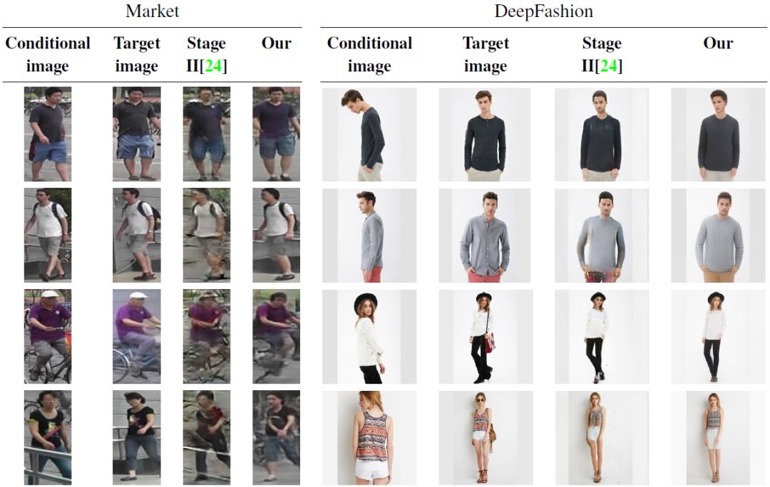 图 8:图像转换与 PG^2 的比较。左侧:Market 数据集上的结果。右侧:DeepFashion 数据集上的结果。外观是从条件图像中推理得到的,姿态是从目标图像中推理的得到的。要注意,本文的方法不需要关于人物身份的标签。 论文:A Variational U-Net for Conditional Appearance and Shape Generation(用于条件式生成外貌和形状的变分 U-Net)