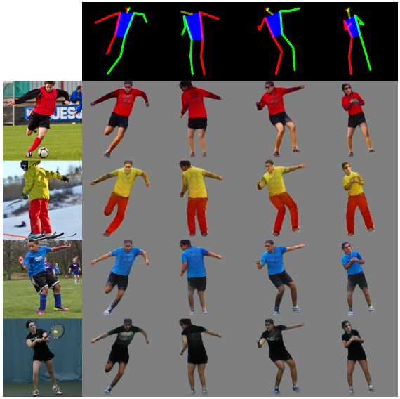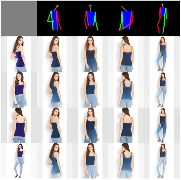 图 7: DeepFashion 数据集上外观转换的稳定性。每一行都是使用最左侧图像的外观信息合成的,每一列都是对应于第一行的姿态的合成。需要注意的是,推理得到的外观在很多视角上都是不变的。