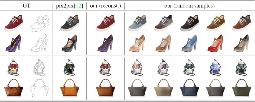 图 3: 仅仅将边缘图像作为输入时的生成图像(左侧的 GT 图像被保留了)。研究者在鞋子数据集 [43] 和挎包数据集 [49] 上将本文的方法与 pix2pix 进行了对比。在图的右侧是从变分 U-Net 的潜在外观分布中的采样。