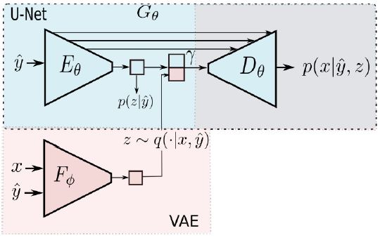 图 2: 条件 U-Net 与变分自编码器相结合。x:查询图像,y hat:形状估计,z:外观。