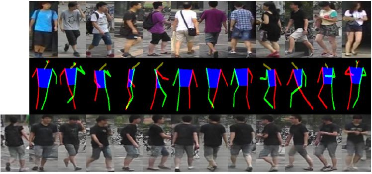 图 6: Market-1501 数据集上的外观转换。外观由左侧底部的图像提供。yˆ(中间)是从顶部图像中自动提取,并向底部进行转换。