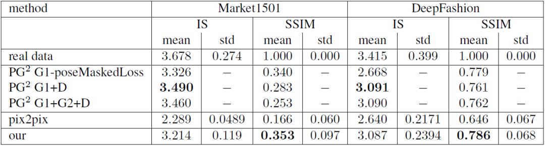 表 1: 在 DeepFashion 和 Market1501 数据集上重建图像的结构相似性(SSIM)和 Inception score(IS)。本文的方法要比 pix2pix[12] 和 PG^2[24] 具有更好的 SSIM 性能,至于 IS 性能,本文的方法要比 pix2pix 好一些,并且和 PG^2 有着相当的结果。