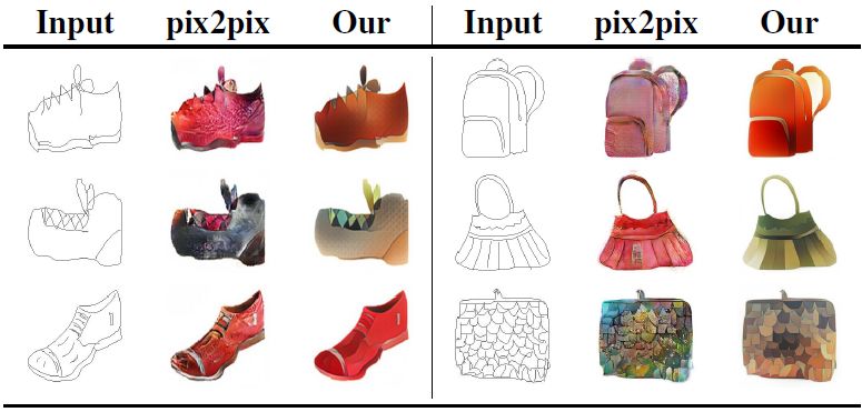 图 5: 草图着色:比较 pix2pix[12] 和本文的模型的生成能力,本文的模型是在实际图像上进行的训练。任务是为鞋子和挎包的手绘草图生成合理的外观 [9]。