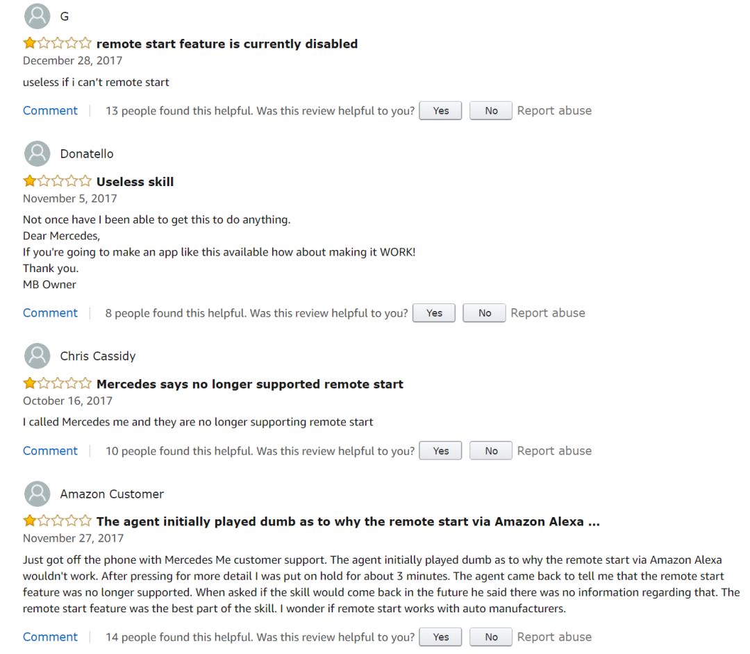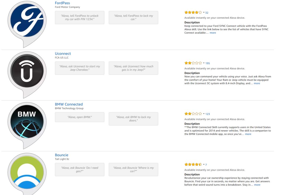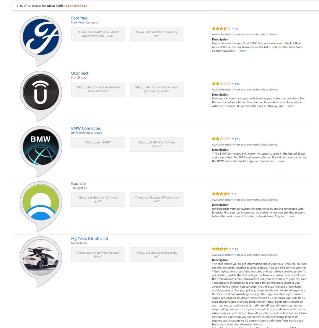 各大车厂自然没有放过那波移动互联网热潮,基本各个品牌都有自己提供软硬件产品及服务的客户端,譬如奔驰有 Mercedes me,福特有 FordPass,宝马有 BMW Connected… 这些官方出品 app 的接口向 Alexa 开放后,Alexa 能做的,就是「调动这些 app 来执行用户的指令」。如「Alexa,让 Mercedes me 给我锁上车门」「Alexa,让 FordPass 打开车内空调」等等。 因此,虽然阿里这次与奥迪等车企的「合作告示」仅仅公开了一些概念,但「家车融合」与「人车融合」的实现形式,无外乎以上几种。 据阿里达摩院人工智能实验室负责人浅雪透露,6 月发布的第一份具体方案,将集中在「家车融合」上,也就是「在家控制汽车」。 再结合产品总监释空强调的「与操作系统没有很大关系,会更多集中在语义理解与后续的服务处理能力上」,也就不难猜测,双方的初步合作应该是上面的第 1 种与 4 种形式: 品牌的联网车辆可以去调用 Aligene 平台上的接口,并被授权使用平台上的内容资源;同时,平台会针对各个品牌增加一些汽车控制类的 skill(技能)。 本质上跟你用天猫精灵打开第三方台灯与空调的道理是一致的。 「我们会把整个需求处理成两部分。一个叫通用需求,对所有合作的联网车都适用,」释空认为做定制化需求是有必要的,「另一个就是各家车企都有自己的特色与一些不同的主攻方向,比如沃尔沃可能注重安全,戴姆勒偏向舒适驾驶,我们会做一些定制化的语音控制方案。」 但汽车的特殊之处在于,它既可以被看作是一种可连接的硬件产品,又可以被看作是一种场景。 一直以来,厂商都倾向于给智能音箱强加一个「家」的使用场景。但实际上,「封闭而稳定的空间」,更符合这个产品的场景定义: 一个房间,一间办公室,或是一辆汽车。 汽车之于智能音箱,是一个「可满足某些刚性需求」且「能够充分横向提升音箱使用粘度」的特殊介质。 首先,在我们昨晚收集到的几十份车主对远程操控的需求中,「是否可以再次确认车门上锁」「是否可以在夏天提前打开车载空调预冷」以及「能否监测到车前后方有车辆阻挡并及时汇报」等条目,是提及率最高的。 很显然,这些需求背后隐藏的问题一直普遍存在且尚待解决。 「很多时候小区里乱停车,有车正好卡在你前面,根本出不去。很多人会在小区持续鸣笛让那人下来把车开走,太扰民。假如汽车在感应到有车停在前面或后面,就发回来一个提示,那样倒是解决了个麻烦」一位车主这样抱怨。 其次,亚马逊的 Alexa 在车主群体中受到的广泛好评与车企伙伴的拓展速度,就充分印证了这一点。 在亚马逊官网 Alexa Skill 列表里,与汽车联网控制有关的 skill 有 50 多项,其中约有一半是在近几个月内上线的。包括福特、奔驰、宝马、尼森等品牌的客户端,以及部分智能车载产品都与 Alexa 进行了集成。 符合限定条件的车主完全可以利用 Alexa,以控制 app 的方式间接远程控制汽车,完成像「能确认是否锁好了车?」「现在油还剩多少?」「今天驾驶里程数是多少」「能否远程激活灯光?」等指令。 但如同上面所说,要实现这些指令,有很多限定条件——首先,这辆车必须是联网汽车。能上网是所有智能化操作的前提。 其次,Alexa的车辆控制技能一直是单向性的。也就是说,你只能在家中控制汽车,「车控家」的愿景还只是个愿景。 最后,出于车企的多方面顾虑,Alexa 只能靠操控这些品牌的客户端来间接控制汽车。 此外,每种汽车品牌的「开放」程度也有明显差异。 譬如 Jeep 只有特定型号的车才能使用远程控制技能;而宝马的 Alexa 技能则仅限于美国用户,且一个 ConnectedDrive 账户只能对应一辆车。 Jeep 的移动客户端 Uconnect 上指出,用户的 Ram 或 Jeep 车辆必须配备有 Uconnect 3C 系统,并注册了 Uconnect 接入连接服务 因此,Alexa 汽车控制类 skill 的打分也呈现两极分化: 一方面,能够享受到 Alexa 远程控制技能的车主表示非常满意;而另一方面,在限定条件外的车主则非常沮丧。 没错,图中很多技能综合评分很低,就是因为一些车主对于自己的车不能使用远程控制技能感到很不满。 但这也从侧面说明「远程控制汽车」是一个受智能音箱用户欢迎的功能。 主流车厂的综合评分普遍很低,因为限制很多 这么说来,在众多应用场景中,天猫精灵选择迅速与多个全球主流车厂进行打通,更像是在「复制」一种被验证过的成功。试图继续「以快为本」,进入一个国内尚未被充分「开发」的对标应用空间。 不过国内外的人车交互场景有许多在交通环境、使用习惯以及文化等方面的差异,这给阿里等智能音箱品牌提供了一个「本地化」的机会。 譬如在涉及到「远程打开车门」这个问题上,国内用户更担心的是安全。在几十位国内车主中,大多数认为这是一项不必要的技能。 而释空也表示,未来在天猫精灵所有的汽车控制技能中,可能只会有「上锁」,不会有「启动」。 不过,国外的用户态度却恰恰相反: 在奔驰 Alexa 控制技能的评价中,许多打 1 分的用户都在抱怨奔驰公司突然暂停了「远程启动」(remote start)这项功能。 都是对取消这一功能表示不满的评价 对于阿里来说,目前尚不知晓,沃尔沃、奥迪与宝马可以与天猫精灵「深交」到什么程度,但目前能得到的消息是,这几家在中国国内量产的可联网车型,都将会与天猫精灵进行互通。 不过根据各个车厂的不同要求与条件,天猫精灵或许也会遇到跟 Alex
