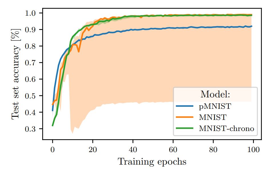 图 1:在 MNIST 和 pMNIST 上训练的 LSTM 的测试准确率。