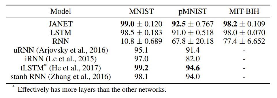 图 3:不同层大小的 JANET 和 LSTM 在 pMNIST 数据集上的准确率(%)。 论文:THE UNREASONABLE EFFECTIVENESS OF THE FORGET GATE