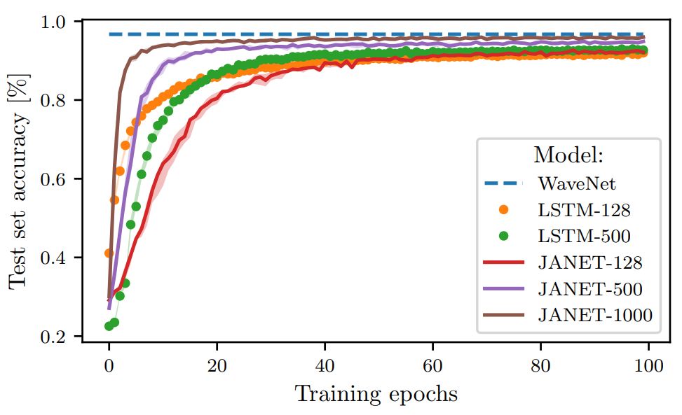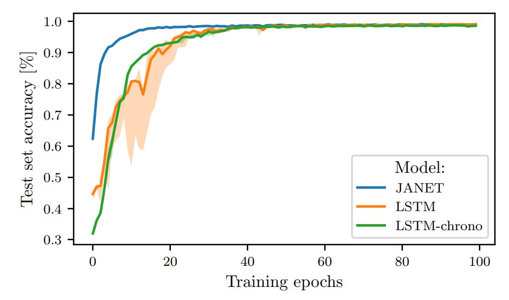图 2:JANET 和 LSTM 在 MNIST 上训练时的测试集准确率对比。