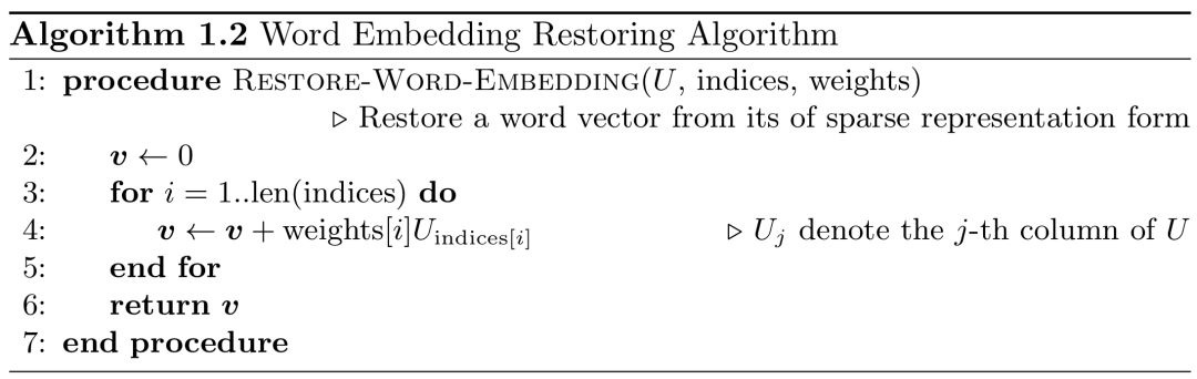 这个算法很大的特点是实现了一个二元搜索来确定α,因为我们不能直接控制稀疏矩阵 x 的稀疏程度,所以我们根据稀疏矩阵的非零元素数来控制α的变化。整个稀疏词表征算法需要输入过完备基矩阵 U(常见词)、完整词嵌入矩阵 w、稀疏程度 s 和作为终止条件的容忍度 tol。 其中 s 是非常重要的一个参数,它控制了一个词最多需要多少个过完备基向量表征。kika 表示:「s 是一种权衡,如果参数较大,那么压缩比就会很小,模型达不到预期效果。如果参数较小,那么重构的词表征就不能有效地表示所有词。」正因为需要进行精调来确定 s 及其它超参数,kika 表明总体模型调优时间是训练时间的 4 到 5 倍,所以整个稀疏词表征的训练过程还是比较挺长的。 如上算法所示,首先我们会确定α的搜索范围,然后取α的中间值并最小化损失函数而求得稀疏表示 x*,并统计 x* 中每一个列向量的非零元素数,它们代表了一个词需要多少个常见词表示。如果 k 大于 s,那么非零的元素就过多,我们需要加大 α 以增强 L1 正则化的效果。这样的二元搜索直到α的上下界距离小于参数 tol 才会终止,且一般迭代几次就能快速收敛到合适的 α 来控制 x* 的稀疏性。在完成 x* 的学习后,我们将每一列稀疏向量抽取为对应的索引与权重,索引代表使用哪些基向量或常见词,而权重代表它们定义某个词的重要性。 又因为前面的二元搜索将 k 限制为不大于 s,所以有可能 k 是小于 s 的,因此我们需要使用零将这些向量补全。经过上面的步骤,最终我们会产生包含 s 个元素的等长向量 indices 和 weights。储存这两种向量而不直接储存稀疏矩阵 x* 能节省很多空间,这对于减小安装包大小有非常重要的作用。 论文中给出的词嵌入恢复算法以一种串行密集运算的方式进行展示,这可以令读者清晰地理解重构过程: