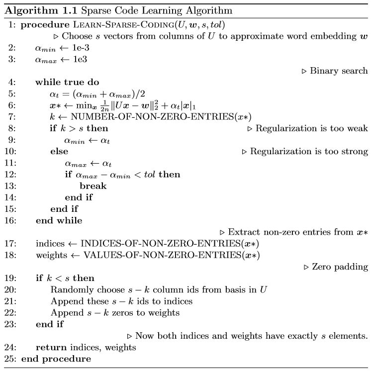 其中第一项表示通过稀疏表示 x 预测的词向量与完整词向量(w)间的 L2 距离。后一项为 L1 正则化,它会将矩阵 x 中的元素推向 0,从而实现稀疏表示。 在 kika 的论文 Sparse Word Representation for RNN Language Models on Cellphones 中,他们使用了以下伪代码展示了稀疏表示的学习算法: