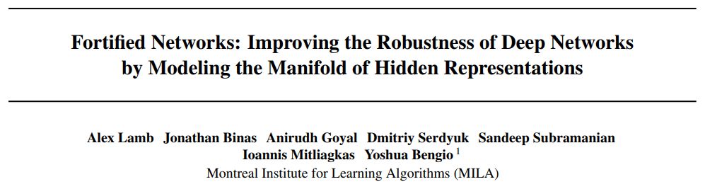 | 1 引言 深度神经网络已经在很多不同任务上都取得了成功。这样的成功推动了其在可靠性与安全性至关重要的领域的应用,其中包括自动驾驶汽车(Bojarski et al., 2016)、医疗保健、人脸识别(Sharif et al., 2017)以及恶意软件检测(LeCun et al., 2015)。当智能体所使用的系统表现不佳时,安全性问题就会出现。当模型在训练过程中看到的输入数据的分布不同于模型评估的数据分布时,会出现可靠性问题。 对抗样本(Goodfellow et al., 2014)是一种攻击神经网络模型的方法。这种攻击是对输入进行微小的扰动,从而改变所预测的类别。需要指出,得到肉眼无法察觉的微小扰动是可能的。事实证明,简单的梯度方法就能让人找到往往能改变输出类别的修改输入的方式(Szegedy et al., 2013; Goodfellow et al., 2014)。更近期的一项研究还表明,有可能通过创造甚至能贴在摄像头上的贴片来改变具有高置信度的输出类别(Brown et al., 2017)。 为了应对对抗样本,研究者开发了一些防御方法。其中一些最为突出的防御类型包括特征压缩(Xu et al., 2017)、输入的自适应编码(Jacob Buckman, 2018)、与 distillation 相关的方法(Papernot et al., 2015)。现有的方法能实现一些稳健性,但大都不易部署。此外,事实证明很多方法都容易受到梯度掩码的影响。而其它一些方法还需要直接在可见空间中训练一个生成模型,这目前甚至在相对简单的数据集上也很难办到。 我们的目标是提供一种方法,其(i)是通用的,可加入到已有的网络中;(ii)能使网络在对抗攻击下保持稳健;(iii)能为输入数据的存在提供一个可靠的信号,且不取决于网络训练所基于的流形。直接在输入数据上使用生成模型来提升稳健性并不是什么新思想。我们的主要贡献是在所学习到的隐藏表征的分布上实现了这种稳健性,而不是让对流形外的样本的识别更容易,如图 1 所示。 我们提出了 Fortified Networks(防御增强型网络)。其防御增强方法包含使用去噪自动编码器来「装饰(decorate)」原始网络的隐藏层。我们使用了 Python 意义上的「装饰」,可以应用于任何函数(在这里是网络的一部分)并将其行为无明确修改地延展。防御增强方法满足上面陈述的三个目标。我们会讨论这种隐藏层的防御增强方法的直观理解并阐述该方法的一些显著属性。我们在 MNIST、Fashion-MNIST、CIFAR10 数据集上针对白盒攻击和黑盒攻击对我们提出的方法进行了评估。