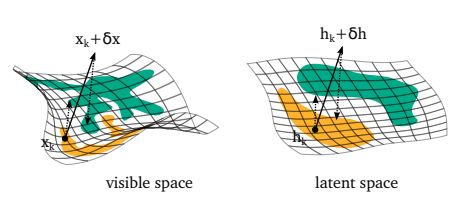 图 2:在可见空间(左)和隐藏空间(右)中映射回流形的过程的示意图。阴影区域表示空间中由给定类别的数据点所占据的区域(它们不表示决策边界)