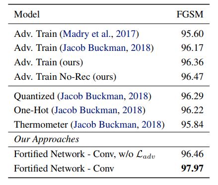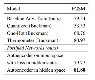 表 4:在使用标准的 ε = 0.03 的 FGSM 的白盒 CIFAR 攻击下的准确度,其中每个模型都是一个卷积网络。我们的基准对抗训练方法是来自(Nicolas Papernot, 2017)的残差网络模型。 标题:防御增强型网络:通过建模隐藏表征的流形来提升深度网络的稳健性(Fortified Networks: Improving the Robustness of Deep Networks by Modeling the Manifold of Hidden Representations)