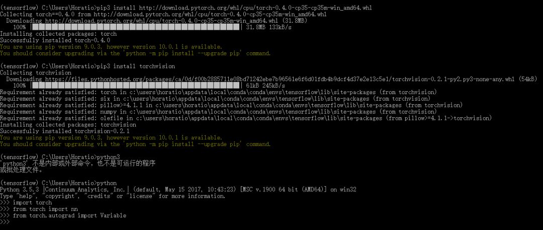这一次更新从 0.3.1 到 0.4.0 有着非常多的改进,最重要的就是官方支持 Windows 系统。在没有官方支持前,Windows 上安装 PyTorch 需要借助其它开发者发布的第三方 conda 包,而现在我们可以直接在 PyTorch 首页上获取使用 conda 或 pip 安装的命令行,或跟随教程使用源文件安装。 当然除了 Windows 支持外,0.4.0 版的 PyTorch 还重点权衡了计算中的内存、支持多种概率分布、优化数据类型和修正张量等。机器之心也尝试在 Windows 安装简单的 CPU 版,如下所示我们使用 pip 可以非常轻松而流畅地安装 PyTorch。