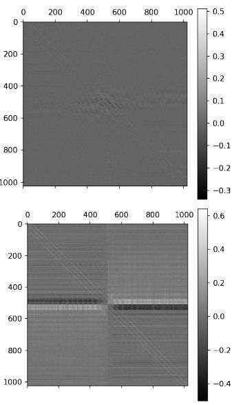 图 4:(b) 训练后的基线权重 wi,j 矩阵(顶部)以及可塑性系数αi,j(底部)。每一列描述了单个单元的输入,垂直相邻的元素描述图像中水平相邻像素的输入。注意两个矩阵中的关键结构。