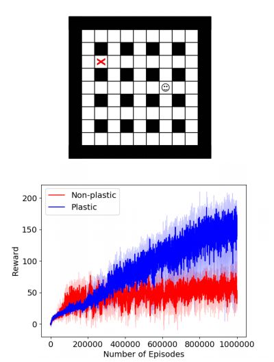 图 6:顶部:迷宫的示意图,指出了智能体的位置(用笑脸表示)以及奖励位置(用红十字表示,红十字只用于图像演示:奖励对智能体来说是不可见的)。底部:迷宫探索任务的训练曲线:每个训练事件(episode)通过 15 次运行得到中位数奖励以及四分位数奖励。 论文:Differentiable plasticity: training plastic neural networks with backpropagation(可微可塑性:利用反向传播训练可塑神经网络)