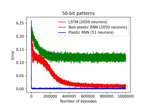 图 3:使用具有 2050 个神经元的非可塑 RNN 的 50 位模式记忆的学习曲线(绿线),使用具有 2050 个神经元的 LSTM 的学习曲线(红线),以及具有相同参数却只用了 51 个神经元的可微可塑权重网络的学习曲线(蓝线)。