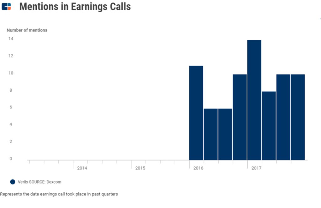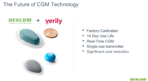 谷歌的小型连续性血糖监测仪(CGM),是 Verily 与医疗器械公司 Dexcom 一起制造的,已经进入商业化准备阶段。Dexcom G6 监测系统已经提交给了 FDA 批准,它可以监测皮肤下间隙血糖水平。 它的长期目标是制造一个更小的一次性传感器——可以像绷带一样佩戴 14 天,并且不需要手指穿刺校准(与现在的 G6 相反,现在的 G6 需要每天做一次手指穿刺校准)。这是在 Dexcom 投资者推介中提到的,如上图所示。 在过去的几年里,Verily 与 Dexcom 的合作在其财报电话会议上被越来越多次的提到。