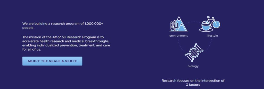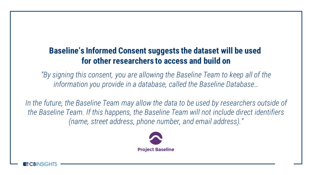 3.为第三方构建数据集 除了插入现有医疗健康系统的数据流以外,谷歌正在构建自己的数据集,其他公司或组织可以将这些数据用在它们的研究中。 Verily 团队正在进行的两个主要数据项目是与 NIH 的 All of Us Research Program(全美国研究计划),以及自己单独在做的 Project Baseline Study(项目基础研究)。 All of Us 研究计划(之前的精准医疗计划)旨在跟踪来自不同背景的 100 万参与者的健康数据。这包括基因组数据、生活方式数据、生物标记数据等。目标是让一群研究人员分析最全面的数据集,以发现关于我们健康的新见解。 2016 年,NIH 向 Verily 提供了一笔为期 5 年的资助,与 Broad Institute 和范德比尔特大学合作,用于构建数据基础设施和分析工具,以容纳包含 79000 名参与者的数据。然而,最近全美研究计划遇到了有关协调的问题,并担心实现其目标过于昂贵和费力。
