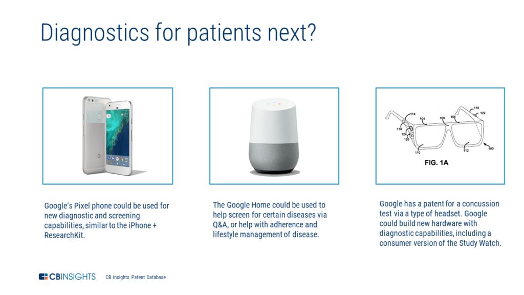 但谷歌有机会在消费者层面更深入地参与疾病筛查与诊断,尤其这一领域正日渐依赖人工智能技术。 一种可能是使用其消费级硬件新品用于健康筛查。随着谷歌对 Pixel 手机的开发,它可以通过 ResearchKit 来效仿苹果在医疗健康方面的举措。利用 iPhone 中的现有硬件,苹果正试图搞清楚消费者能否做疾病筛查,以此类推,谷歌的 Pixel 也可以这样做。 病患健康评估领域的另一个切入点可能是谷歌的语音助理 Google Home。这些工具可以回答健康方面的问题,类似于搜索领域的健康卡,最后也可用于确保患者的药物服从性,帮助管理患者的生活方式。如果其它数据流检测到一些健康异常,它们还可以询问后续问题,以评估患者的风险水平。 谷歌也可以开发自己的硬件来诊断消费者。它已经开发了一个针对研究人员的硬件产品 Study Watch,但随着该公司在消费级硬件领域的发展,谷歌可以把同样的传感器技术加入到自己的可穿戴产品线上。尽管谷歌已经利用手机中的传感器和 Android Wear 来帮助用户计算步数、睡眠等信息,但尚未创建惠及医生的临床级数据,这一举措将带领其硬件业务从健康产业迈向医疗产业。 该公司也在寻找其它有诊断能力的可穿戴产品。谷歌有一个通过耳机测试脑震荡的技术专利,这让人联想到 Google Glass。虽然关于脑震荡测试的信息描述不多,但该专利谈到了眼睛、言语和运动测试的自动化,这些测试是通过将人置于 Glagow Coma Scale 上来评估大脑损伤程度的。