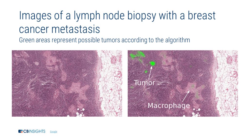 不同癌症类型 谷歌一直在通过其 DeepMind 部门来研究不同的癌症识别方法,并试图创建出不同的癌症治疗计划。 2017 年,该公司发布了有关肿瘤识别的研究,其训练数据集是基于一个现成的乳腺癌图像集,这些乳腺癌细胞已经转移到了邻近的淋巴结。其算法的肿瘤检测准确率为 92%,允许一些假阳性(比如看起来像肿瘤的巨噬细胞)。