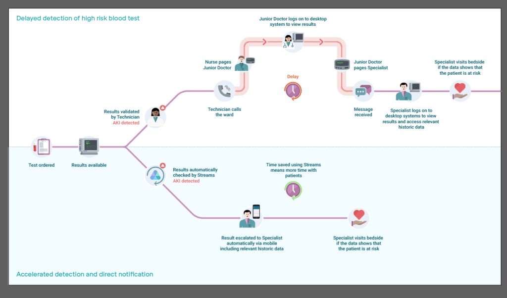 DeepMind 的第一步是构建新的数据基础设施,以便将来自于电子病历、医院设备和医生笔记中的独立数据能够以一个标准的格式整合到一个单独的位置。 使用 FHIR,DeepMind 构建了一个新的数据主干,以使得开发能够分析不同数据元素的应用变得更加容易。例如,谷歌推出了 Streams 应用,通过一个移动应用向医生、护士等推送相关患者的信息和警报来检测急性肾损伤。这可以减少一个案例的严重性,还有不断升级时所涉及的人员数量,这在案例对时间比较敏感时尤其有用。