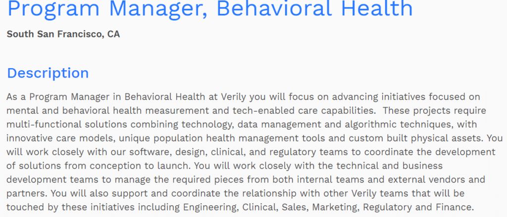 心理和行为健康 谷歌可以通过搜索来检测心理健康问题模式,从而进军行为健康领域。该公司已与美国精神疾病联盟(National Alliance on Mental Illness,NAMI)合作,为寻求抑郁系统的用户开发一份调查问卷。 谷歌风投还投资了 Quartet Health 公司,该公司可以帮助初级保健医生发现未经治疗的心理健康疾病,并指导病人进行适当的护理。Quartet Health 可以利用其专业知识和数据,来帮助谷歌较早检测出行为健康问题。 值得注意的是,Verily 当前的开放职位中包括了一个行为健康项目经理的岗位,这表明它正在瞄准这个市场。