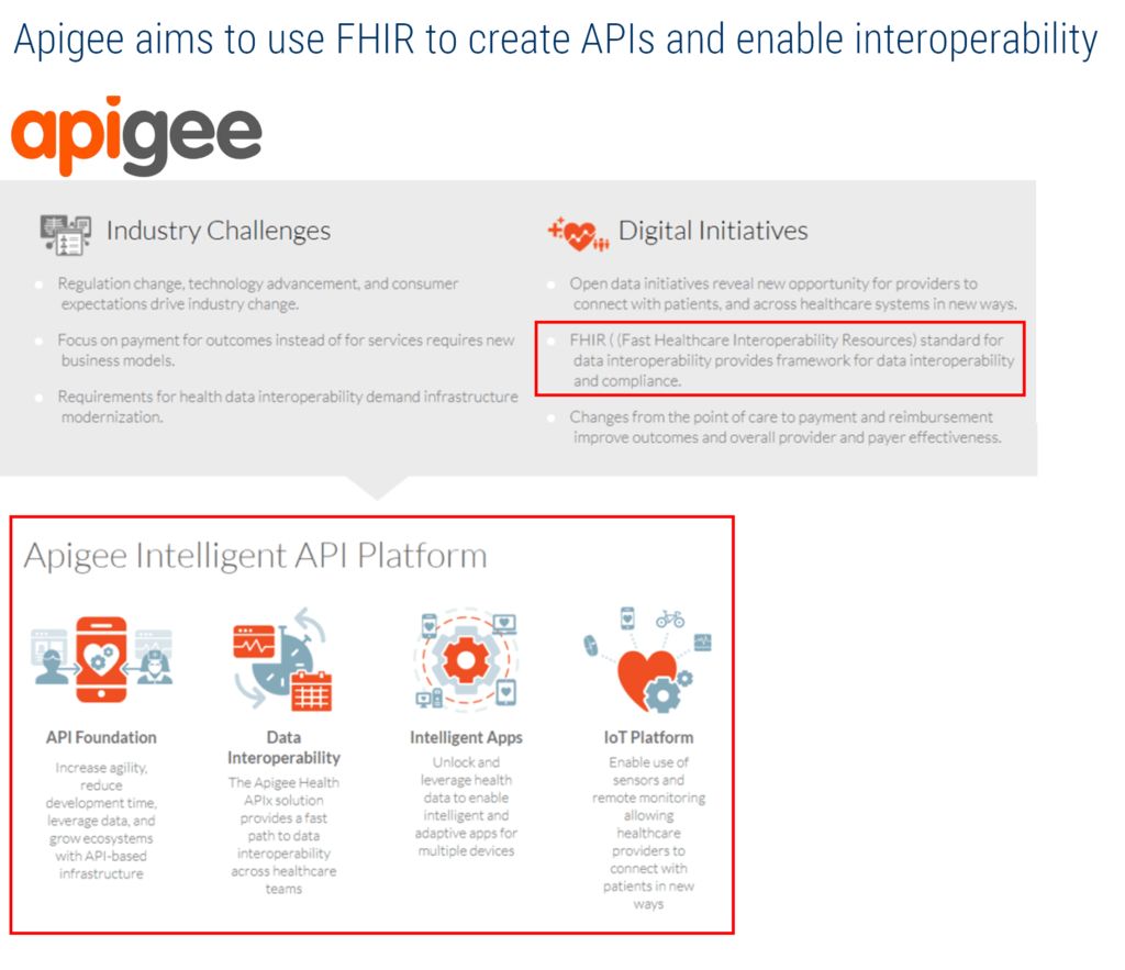 Galvani 的生物电子设备也许能被用在于多发性硬化发展过程中提供帮助。值得注意的是,Verily 有一个神经调节方面的岗位需求,这说明他们将会探索这一领域。 此外,谷歌可能最终会通过创造外部解决方案来帮助运动功能受损的人,从而帮助他们管理这种疾病。ReWalk Robotics 等外骨骼公司就在通过软件、传感器和电子设备的组合来帮助运动功能受损的人保持移动能力。 三、助力医疗健康数据基础设施 医疗保健领域的最大难题之一是数据严重孤立,系统之间互操作能力非常欠缺。甚至在同一家医院内集成不同 EMR 的数据可能就很困难,更不用说来自不同移动应用、互连设备和其它健康追踪产品的数据。事实上,尽管 79% 的医生都认为将所有可用的病人数据都放在一起对他们的工作而言至关重要,但仅有 14% 的医生能访问不同部门、病人护理中心等的 EMR 信息——即使这些部门都在同一家医院。谷歌认为其中一部分解决方案是助力新型数据基础设施层的发展,这涉及到 3 个关键方向: 为健康领域的巨头创造新型的数据流程 推进和推广 Google Cloud 为第三方机构构建谷歌自己的医疗健康数据集 1.为医疗巨头创建数据管道 为了提高医院、医生和其他相关方之间的互操作性,业界正在慢慢地转向一项新的技术,成为 FHIR(更快的医疗健康互操作性资源)。FHIR 为不同的数据元素创建了标准,所以开发者可以构建可被用来访问来源于不同系统的数据的应用程序接口(API)。 谷歌坚信:访问、组织以及解释数据将会是医疗健康领域的未来。2016 年,谷歌以 6.25 亿美元收购了 API 管理公司 Apigee (https://www.cbinsights.com/company/apigee)。Apigee 的一部分业务就是使用 FHIR 构建医疗健康 API。 Apigee 早已与多家知名医疗健康公司合作,包括麦克森公司、克利夫兰诊所、沃尔格林公司等等,它的系统帮助在数据流之间搭建桥梁。其应用案例包括连接多个现存的数据集,否则它们将无法彼此通信,还有使用 Apigee 来构建一个组织的移动应用程序,以及寻求从其他来源(例如可穿戴设备)获得数据的新方法。 谷歌的 DeepMind 也在构建新的数据基础设施。DeepMind 在寻找应用人工智能和分析方法的方式来改善医疗健康。为了实现这一点,需要以可用的、结构一致的格式来访问数据。