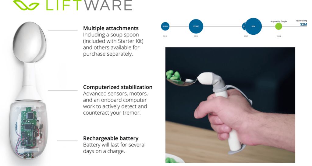 为了帮助患心血管疾病风险高或已经有心脏问题的患者,Verily 已经参与了对 One Brave Idea 的 7500 万美元的支持,这是来自布列根和妇女医院心血管内科的主任 Calum MacRae 博士的一个项目。该项目的目标是更好地理解各种不同类型的心脏疾病的致病因素,以及预防心脏病和潜在的治疗方法。这笔经费是由 Verily,AstraZeneca 和美国心脏协会共同提供的。 尽管该项目的详细情况还不清楚,但 Verily 最终可能会为有心脏病患病风险的人创造一个类似 Onduo 的生活方式管理系统。 4.帕金森症 帕金森病是一种还没有得到很多了解的衰弱性神经疾病。现在,Verily 正试图通过获取和分析数据来理解其病因,从而实现早期疾病识别、个性化治疗和改善管理。 Verily 与荷兰的拉德堡德大学一起启动了 Personalized Parkinson's Project(个性化帕金森病项目),以便将临床数据与 Study Watch 收集到的病人数据结合到一起,其中包括心脏功能、皮肤电流活动和惯性运动等数据。 研究者希望能通过 24 小时不断的监测来确定疾病发作的征兆,比如心律或睡眠模式改变。还有一个希望是 Verily 能使用来自该项目的数据来构建能区分不同帕金森病患者的算法,以实现个性化治疗。 通过个性化帕金森病研究,Verily 开发了一个加密数据库,其中的数据都剔除了身份信息,可供研究者使用。Verily 还为 NIH(美国国家卫生研究院)构建了一个类似的数据库 Knowledge Portal,让研究者可以分享和可视化与帕金森病研究有关的数据集。 通过这项工作,Verily 和研究者希望找到该疾病发作的早期征兆、理解其发展的过程并可能找到创造这种疾病的治疗方法的新方法。 与此同时,Verily 也在寻找帮助帕金森病患者管理自己的日常生活的方法。这项工作始于对 Lift Labs 的收购。Lift Labs 设计制造了 Liftware 智能勺,能帮助帕金森病患者在吃饭时保持食物稳定。这款智能勺及相关附件的售价是 195 美元起。