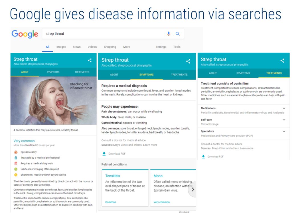 3.为病人提供诊断 谷歌主要是直接与医院、医疗保健供应商和研究人员进行合作,而不是与患者和消费者进行合作。 不过,该公司确实有一些面向病人的健康评估工具,包括在 2015 年推出的健康卡。该公司与美国最大的非营利性综合医疗集团之一梅奥诊所(Mayo Clinic)合作,为常见的健康问题提供疾病信息、征兆和治疗,作用类似于 WebMD(美国最大的医疗健康服务网站)。