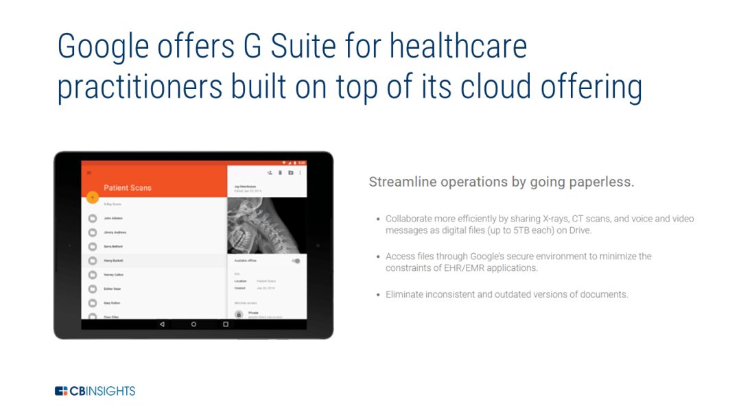 2.推动谷歌云 在过去几年里,谷歌一直在大力推进谷歌云平台,尤其是在聘请前 VMware CEO Diane Greene 来领导这个部门之后。谷歌正在面临与其他云平台科技巨头之间的竞争,包括 AWS(亚马逊云服务)以及微软 Azure 等等。 为了竞争,谷歌正在推动构建在谷歌云平台上的面向医疗健康的服务。一个例子就是之前提到的 Apigee,它提供作为谷歌云套件一部分的 API 管理。 另一个例子就是用于医疗健康业务的 G Suite(驱动器、医生等等)。G Suite 提供兼容 HIPAA 的云服务,医疗健康企业可以用来分享病人的信息,提升患者的体验(例如,使用谷歌 Hangouts)。G Suite 介绍了如何在现有的电子病历之外构建灵活的解决方案,同时还意识到这些解决方案对医疗健康机构造成的挑战。