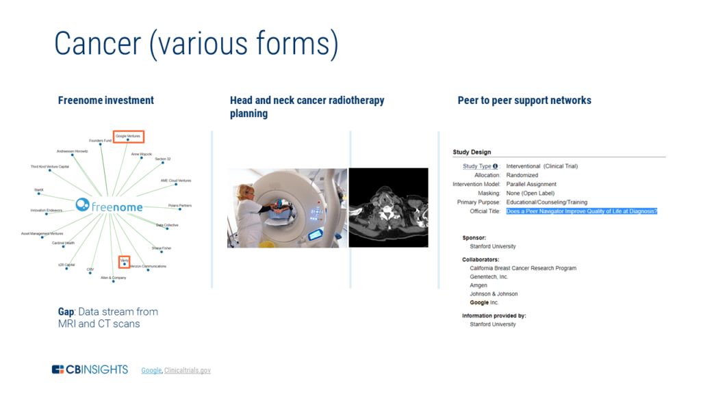 自 2017 年以来,该公司与英国国家医疗服务体系(National Health Service,NHS)和伦敦帝国理工学院的英国癌症研究中心(Cancer Research UK Centre)合作,以进一步开展这项研究,并提高乳腺癌的早期检测水平。 DeepMind 也致力于其它癌症的研究,比如头颈部癌。DeepMind 在这方面的工作更多涉及到治疗方案的设计,同时,该公司还试图应用人工智能来加速映射过程,以确定放疗位置。当前的映射过程大约需要四个小时,而 DeepMind 认为可以将其缩短到一个小时。 值得注意的是,谷歌无法通过自己的业务来生成这些数据,而是选择与医院合作,来获取癌症数据。 事实上,Verily 对 Freenome 的投资也可能成为这个研究方向的一块垫脚石。Freenome 旨在进行早期癌症的检测:在肿瘤形成早期,肿瘤细胞破裂而掉落下来的微量 DNA 片段(循环肿瘤 DNA,ctDNA)会进入外周血循环系统,因此可通过检测外周血中的 ctDNA 含量来判断患癌可能性。 Verily 还可以选择与西门子医疗(Siemens Healthineers)或菲利普公司继续合作,以获得第一手的 MRI / CT 图像,然后使用这些数据来构建算法,以改进检测方案和治疗计划。 另一个可供谷歌探索的领域是在癌症患者的教练指导和生活方式管理方面。在 2005~2006 年间,谷歌参与了一项研究,试图通过一种伙伴指导和导航治疗的方式,让新进癌症患者与癌症幸存者建立联系,不过似乎并没有得出什么结果。