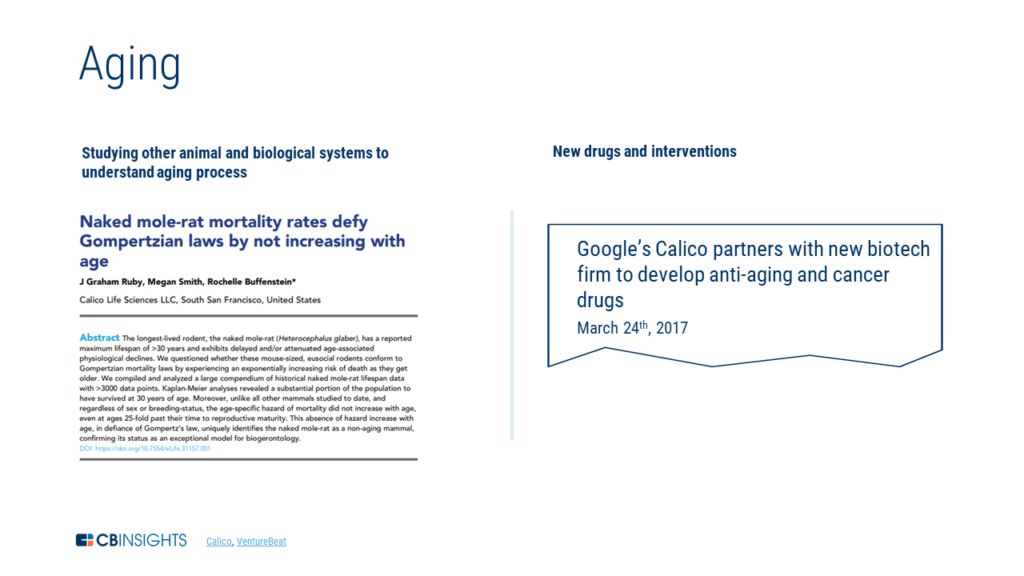 衰老 从谷歌独立出来的 Calico 公司正在试图了解衰老机制。这家公司正在研究不同的生活方式变化、细胞过程、遗传学等如何影响衰老进程。通过这种研究,Calico 试图更好地了解疾病检测和生活方式管理问题,并可能依据各项研究成果来参与数据生成。 该公司最近发布了关于裸鼹鼠衰老模式的研究,并宣布寻求对外合作以开发与衰老有关的药物。