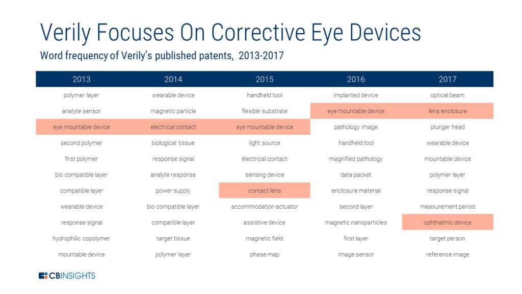 Deepmind 的分部也正在与英国的莫尔菲尔德眼科医院合作,以改善这种眼类疾病的研究,以及帮助眼科医生评估患者眼类疾病的风险,并根据病情的紧迫性指导他们进行医疗护理。在目前的系统中,不管是不是存在紧急情况的频谱,所有的异常都被视为紧急情况。 Verily 不仅仅助力眼类疾病检测,而且还可以潜在的修复某些疾病。分析下 Verily 授权专利中的词汇频率,你就会发现它一直在提交与眼部接触和眼部植入相关的专利。