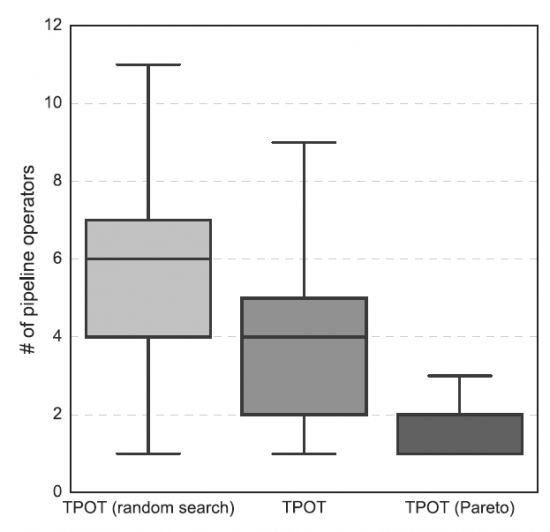图 5 给出了不同方法得到的模型的复杂度,可以看出 TPOT-Pareto 确实能得到更为精简的工作流。一个比较有趣的问题是采用随机搜索的 TPOT-random 在很多任务上(以更高的工作流复杂度)也能够达到 TPOT 以及 TPOT-Pareto 相当的效果。