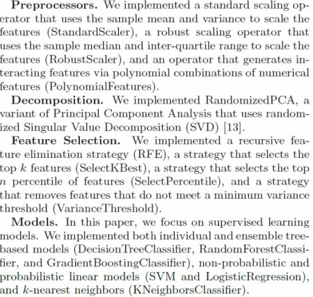 [2] Olson, Randal S., et al. "Evaluation of a tree-based pipeline optimization tool for automating data science." Proceedings of the Genetic and Evolutionary Computation Conference 2016. ACM, 2016.