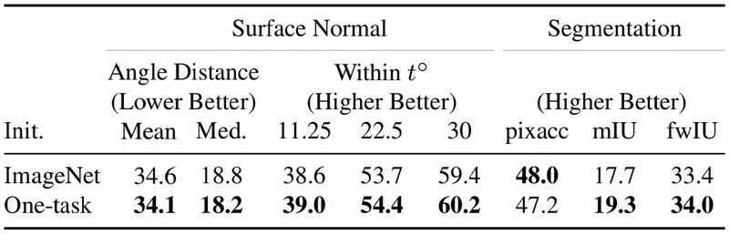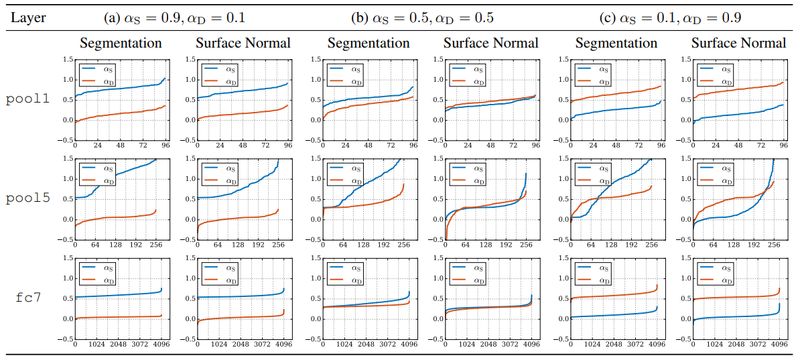 本文使用 AlexNet 网络分别进行图像检测、图像属性生成及图像语义分割、图像平面法向量生成(Surface Normal)等多任务学习。针对两个任务,作者分别从 fc8 层进行共享,一直测试到两者完全不进行共享的为止。