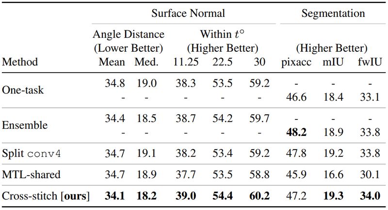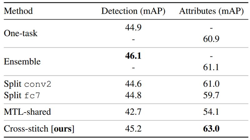 虽然本文作者提到他们的方法相对于传统方法不需要去依次尝试如何选取所要共享的特征层,但是增加的"十字绣"单元同样带来了很多麻烦的东西,例如,如何进行初始化,如何设置学习速率。最终的实验结果表明,使用该方法对多任务学习的性能有一定的提升。
