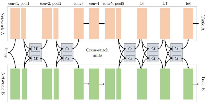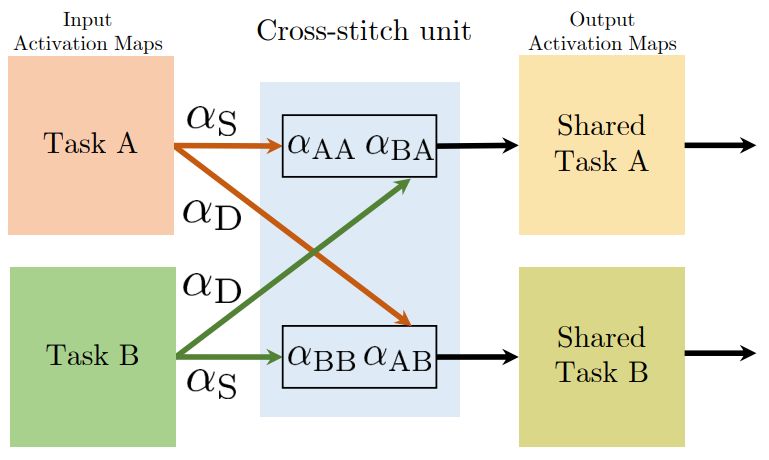 此外,针对不同的多任务学习,我们需要根据任务需求设计不同的共享层,并没有统一的标准。因此,本文针对这一问题设计了"十字绣"单元,通过端对端的学习来自动决定共享层。