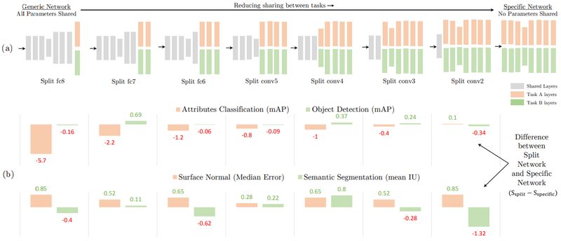 实验结果如图 1 所示,其中,图 1(b)是不同共享层完全独立时的效果对比,可以看出对于任务一来说,共享部分在 conv4 时所能达到的效果,针对于任务二来说,在 fc7 层的效果最好。