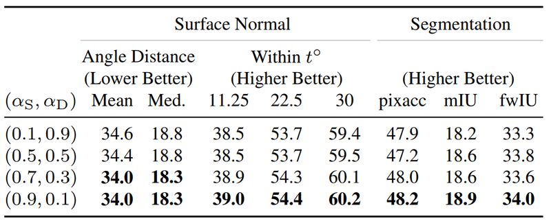 作者分别针对单任务网络、结合两个单任务的网络(文中称为"ensemble")、多任务网络(如图 1 中那样尝试在各个特征层共享特征)进行了实验。平面法向量生成及图像语义分割的实验结果如表 5 所示: