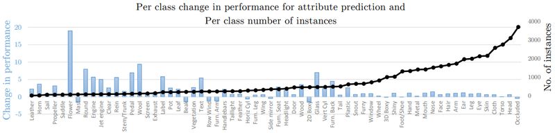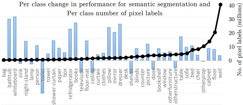 从表 5 可以看出,使用"十字绣"单元的网络均能在两个任务上得到较好的结果。此外,作者分析在图像语义分割任务中,存在严重的数据匮乏问,如图 5 中黑线所示,wall、floor 的数据数量远超出其余的类别数,其中,蓝色柱状表示采用"十字绣"单元的多任务学习相对于单任务学习在效果上的增益,从图中可以看出,数量越少的类别所获得增益越多。