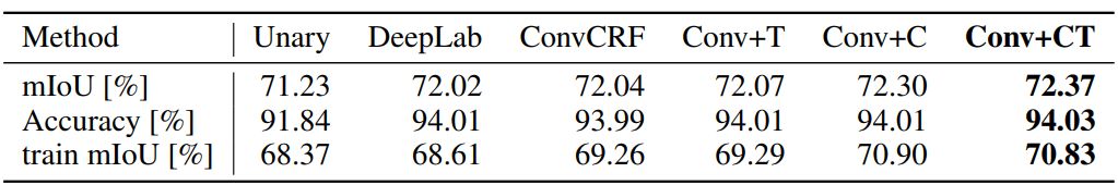 实验中,我们在训练集的 200 幅留存图像上训练条件随机场模型,并在官方 Pascal VOC 数据集的 1464 幅图像上对它的性能进行评估。我们在表 2 中报告了我们的结果,图 3 为模型输出的可视化分析。 表 2:使用解耦训练的条件随机场在验证集上的性能比较。+ C 表示模型使用卷积作为兼容性转换,+ T 表示模型学习了高斯特征。除了来自 DeepLab 的条件随机场,其他模型我们都使用一元运算(unaries)。