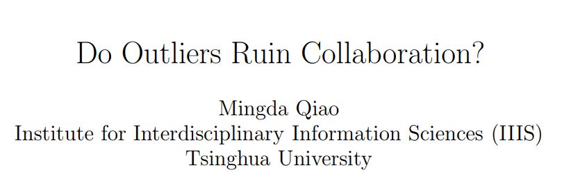 3.2 对子程序的分析 子程序 Candidate(算法 2)是本文算法采样效率的关键,它允许我们学习一个同时对常数比例的活跃用户准确的候选分类器,并仅使用了样本的将近线性的数量(相对于参数|G|和 d)。子程序 Test(算法 3)进一步检查了该学习到的分类器是否对于每个活跃用户足够准确。这让我们可以决定某个用户在下一次迭代中是否应该被保留在活跃用户中。本节将对这两个子程序进行分析。 4 计算开销的下边界 在这一部分,作者表明当 n=Θ(d) 时,Ω(ηn + ln n) 的计算开销是不可避免的,因此,由算法 1 达到的计算开销是最优的并达到一个常数因子(当用户数量和假设类的复杂度相当时)。 5 讨论:存在计算效率高的算法? 虽然算法 1 被证明在某些情况下能达到最优的样本复杂度开销,但是当有大量用户时,该算法的计算效率低下,且实际使用有限。具体来说,候选子程序对于所有大于等于 9/10|G|的用户子集执行穷举搜索法,因此可能会指数级次数地调用 oracle O_F。相比之下,朴素方法分别学习不同的用户,因此即使有Ω(n) 的开销,但它只会调用 n 次 oracle O_F。当然,有人可能会疑惑是否能找到一个计算效率高的学习算法同时解决上述两种开销?但作者认为,这种算法是不存在的。 猜想 5.1:对于所有α > 1 和β < 1,当η = Ω(n^α) 时,没有学习算法能多次调用多项式 oracle O_F 实现 O(n^β ) 开销。 换句话说,当有非常多的恶意用户时,任何高效的学习算法都能产生近线性的开销。作者注意到有必要假设α > −1,因为当最大可能恶意用户数ηn 为常数时,学习算法可以在多项式时间内枚举恶意用户的子集,从而有效地实现最优开销。证明或证伪猜想 5.1 将大大加深我们对协作学习中任意异常值影响的理解。 本文提出的样本效率学习算法的关键是识别一大组用户的候选子程序,例如一些分类器 f hat ∈ F 与它们的标注样本保持一致性。引理 3.1 进一步保证了 f hat 至少对于一半的用户是 ε-accurate。这使得我们能够满足 O(ln n) 迭代中几乎所有的用户,并产生了开销中的 ln n 项。 作者注意到,找到一组有一致数据集的用户可以推广到搜索无向图中较大团的问题:对于节点标注为 1 到 n 的无向图,我们构建用户的 oracles O_1 到 O_n,其中如果图中没有(i,j),O_i 和 O_j 会在相同数据上产生冲突标签。此外,当且仅当一组用户在对应的图中形成一个团,它们才拥有一致的数据集。 不幸的是,Zuckerman[13] 证明了即使无向图中已知包含一个大小为Ω(n)^5 的隐藏团,为任意的β<1 找到一个大小为Ω(n^(1−β) ) 的团仍然是 NP-hard 的。这意味着,使用算法 1 的方法,一个计算高效的算法在每一次迭代中只能为最多 O(n^(1−β) ) 个用户寻找准确的分类器。因此,为了满足所有 n 个用户的需求,需要Ω(n^β ) 次迭代。所以该算法的计算开销为Ω(n^β )。 论文:Do Outliers Ruin Collaboration?