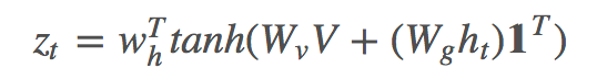 其中 g 是 attention function,V=[v1,...,vk] 代表 k 个区域的图像 feature,ht 是 t 时刻 RNN 的 hidden state。 由此可以得到 k 个区域的 attention 分布 αt: