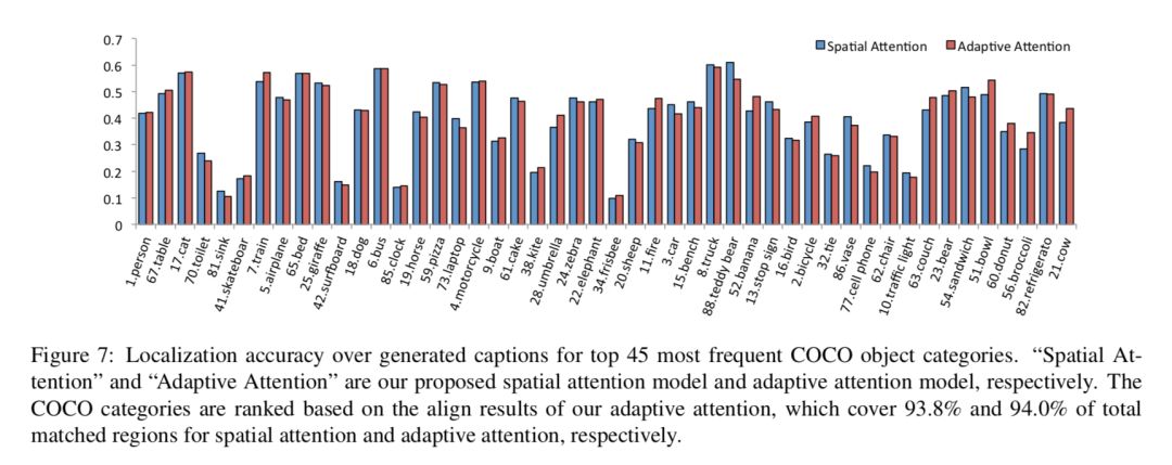 并计算生成的和真实 bounding box 的 IOU (intersection over union),对于 spatial attention 和 adaptive attention 模型,其平均定位准确率分别为 0.362 和 0.373。说明了,知道何时关注图像,也能让模型更清楚到底要去关注图像的哪个部分。