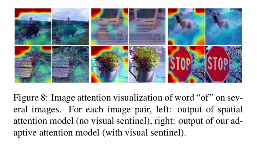 Fig 8 显示了单词"of"在 spatial attention 和 adaptive attention 模型中的 attention map。如果没有 visual sentinel,非视觉词如"of"的 attention 就会高度集中在图像的边缘部分,可能会在反向传播时形成噪声影响训练。